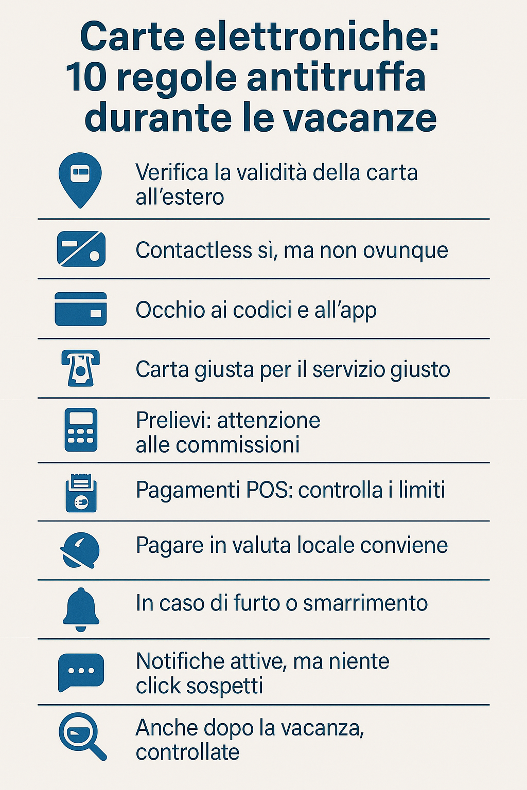 Le carte elettroniche sono strumenti comodi e sicuri, ma solo se usati con consapevolezza. Una verifica in più prima della partenza e un occhio vigile durante il viaggio possono fare la differenza tra una vacanza rilassante e una piena di grattacapi.